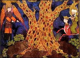 At that time he saw a large tree which does not resemble any of the trees of Paradise, a tree without description, covering all the Paradises, heavens, and universes. The trunk of the Tree was a huge angel named Samrafil. The Prophet could see nothing else besides it. It grew from an infinite, unimaginable, indescribable ocean of musk.